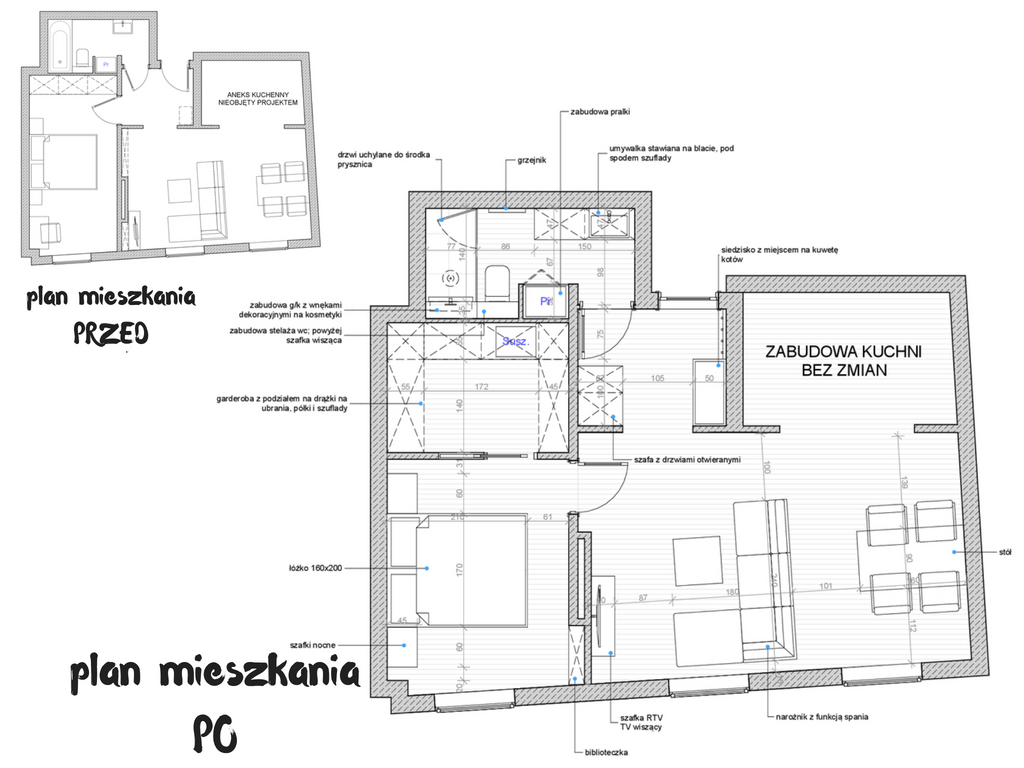Po 6 tygodniach intensywnej pracy udało nam się zakończyć i zrealizować wszystkie zaplanowane prace. Choć część mebli ruchomych nie dotarła na czas (Święta, urlopy, gorący okres zakupowy) to właściciele, zgodnie z planem wprowadzili się na początku lutego. Największe zaskoczenie przeżyły koty klientów, które po przekroczeniu progu nowo zaaranżowanego mieszkania, cofnęły się i uciekły na klatkę schodową, myśląc, że to nie ich dom. Na szczęście ostatecznie przekonały się do zmian i teraz chętnie wylegują się w nowej sypialni 🙂